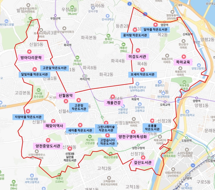 서울시 양천구에 있는 도서관들을 지도에 표시해 보았습니다. 위 지도에서 분홍색 글상자는 양천구 구립 도...