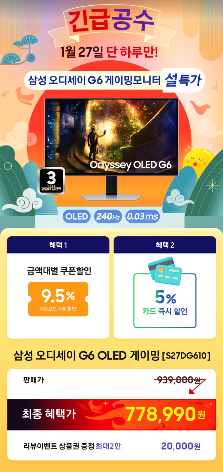 [옥션&지마켓] 설빅세일 - 삼성 오디세이 G6 OLED 게이밍모니터 [S27DG610] 특가 (67만원대)