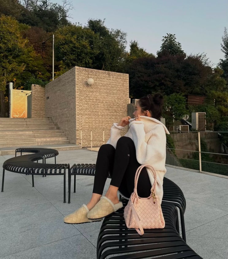 보테가베네타 레지 슬리퍼, 파라슈트 숄더백 겨울 코디법