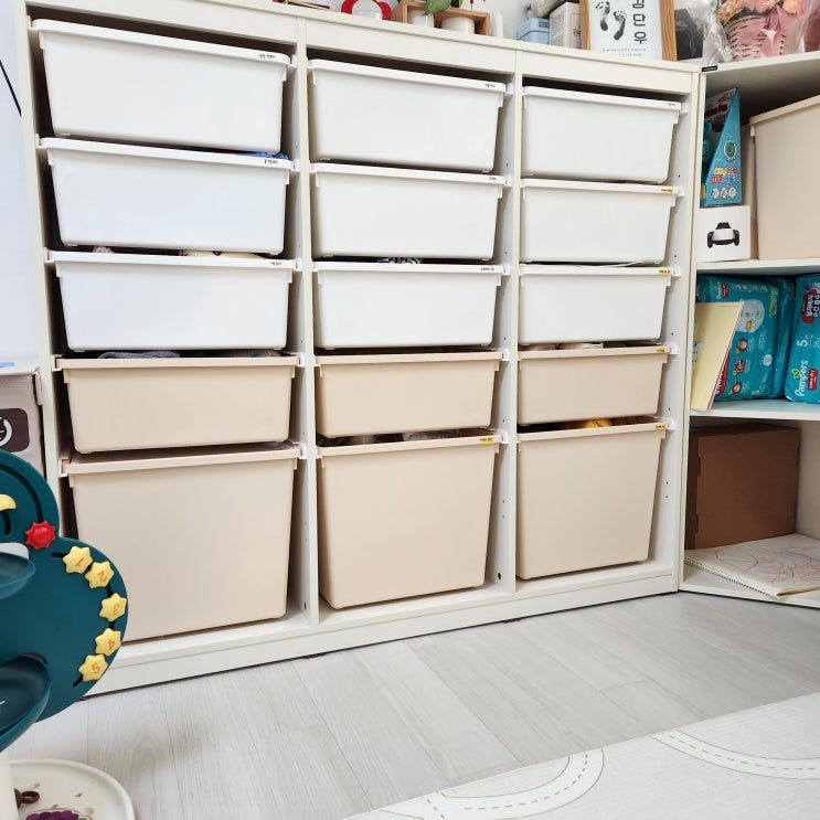 임신 중기 쯤에 내돈내산했던 샘키즈 아기 수납장과 책장, 코너장. 처음에는 수납장에 옷을 어떻게 분류해...