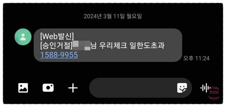 아이가 우리은행 체크카드로 온라인 결제를 하려고 하는데 승인거절 문자메시지를 받았다고 해결해 달라고 ...