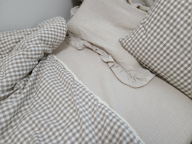 이사 오면서 귀여운 이불을 샀는데요! 베이지색 체크 이불인데, 기존에 쓰던 침대패드가 흰색이라 너무 따...