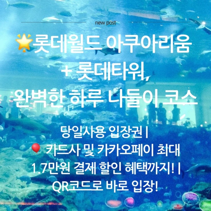 ? 롯데월드 아쿠아리움 + 롯데타워, 완벽한 하루 나들이 코스 | 당일사용 입장권 | ? 카드사 및 카카오페이 최대 1.7만원 결제 할인 혜택까지! | QR코드로 바로 입장!