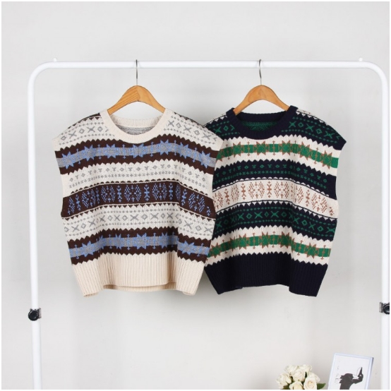 보헤미안 여성 니트 조끼 봄 가을 캐주얼 라운드넥 자카드 베스트 원피스코디 크롭 조끼