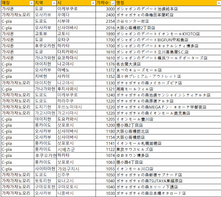 일본 3대(?) 가챠샵 리스트
