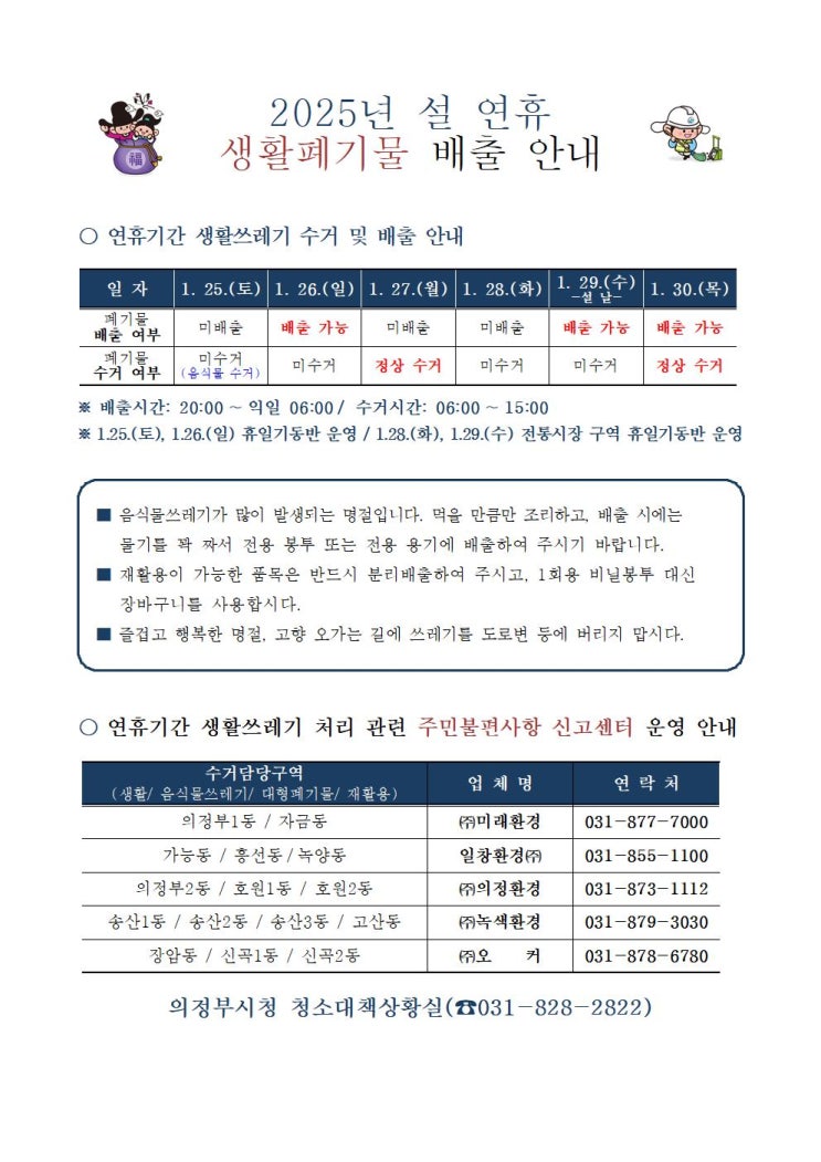 의정부 2025년 설 연휴 생활쓰레기 배출 안내