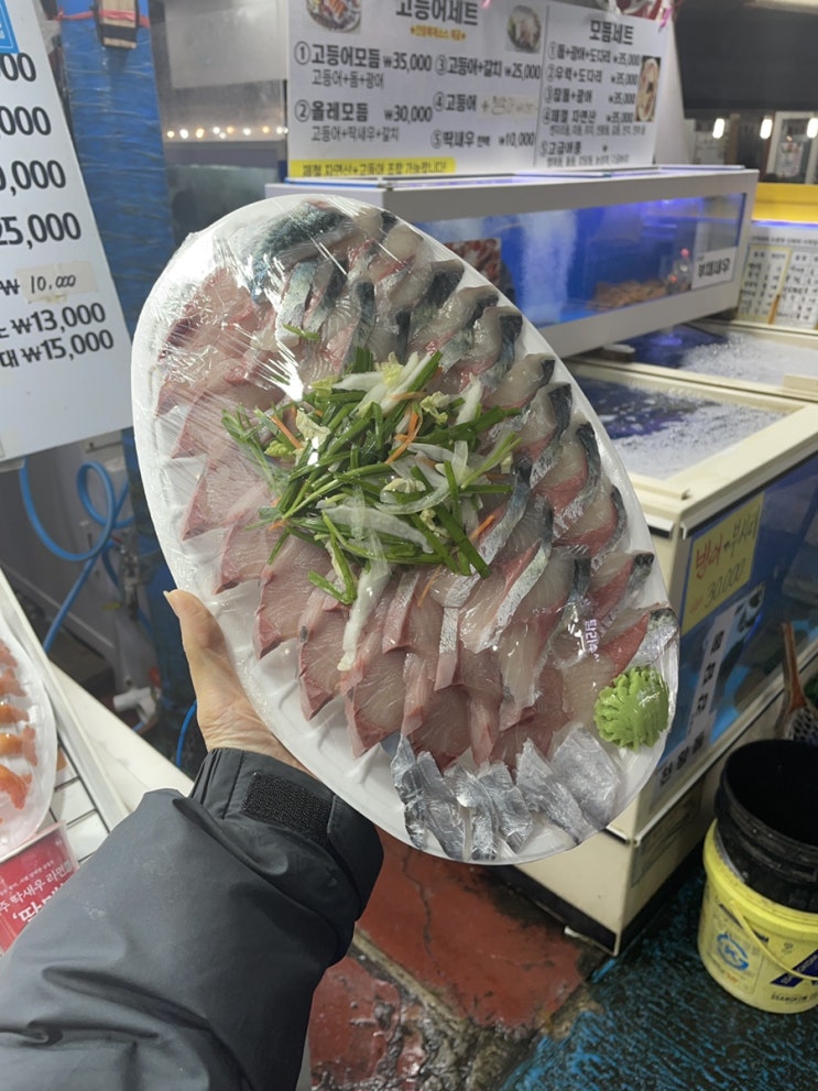 올레시장 횟집 바다수산 싱싱한 방어회 고등어회 포장 성공적