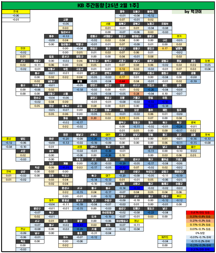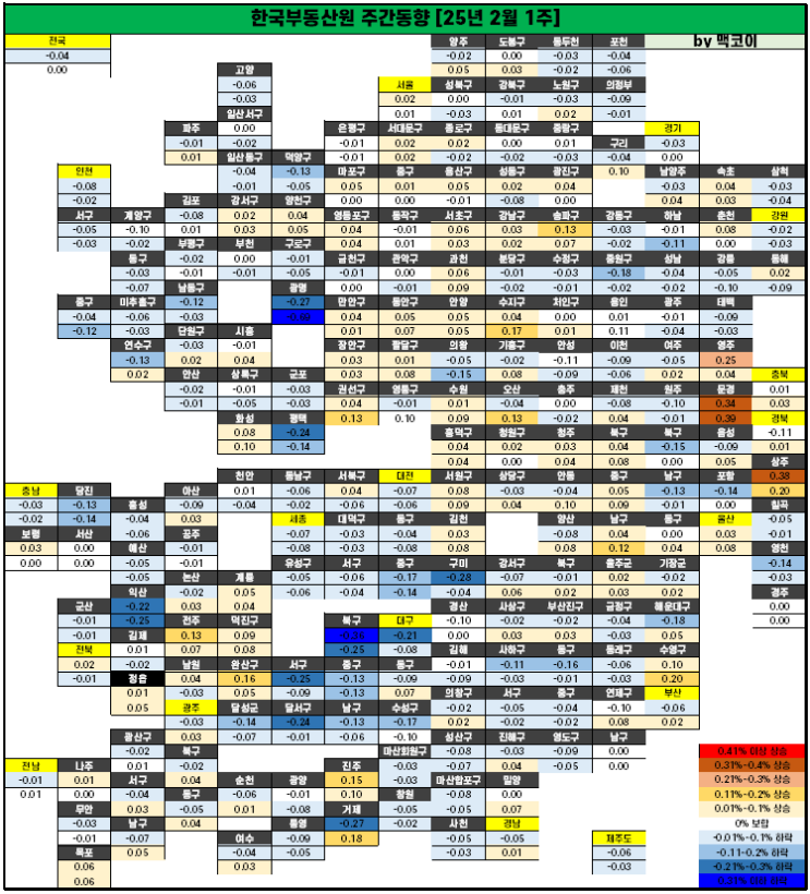 한국부동산원(원장 손태락)이 2025년 2월 1주(2.3일 기준) 전국 주간 아파트가격 동향을 조사한 결과, 매매...