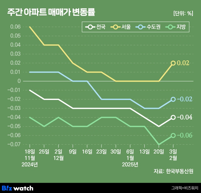 5주 만에 다시 고개 든 서울 집값…무슨 조짐? 서울 0.02% 상승, 전국 집값도 낙폭 줄어 심리위축, 관망세...
