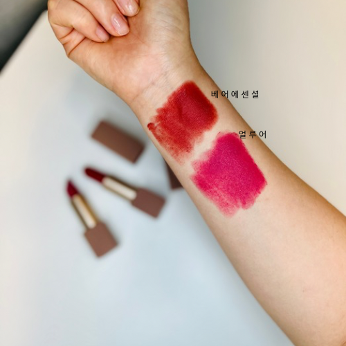 힌스 무드인핸서 마뜨 립스틱 뉴트럴한베어에센셜과 여쿨찰떡 얼루어 발색비교