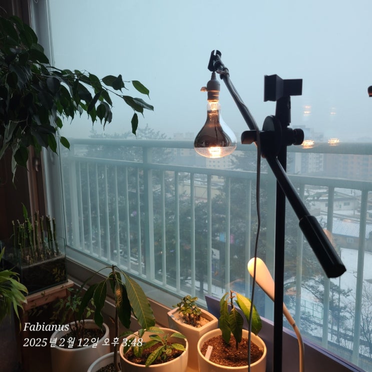겨울철 실내 열대식물 난방과 성장을 위한 조명. 히팅 램프. 일광등. 보온등. 애플망고 나무 키우기.