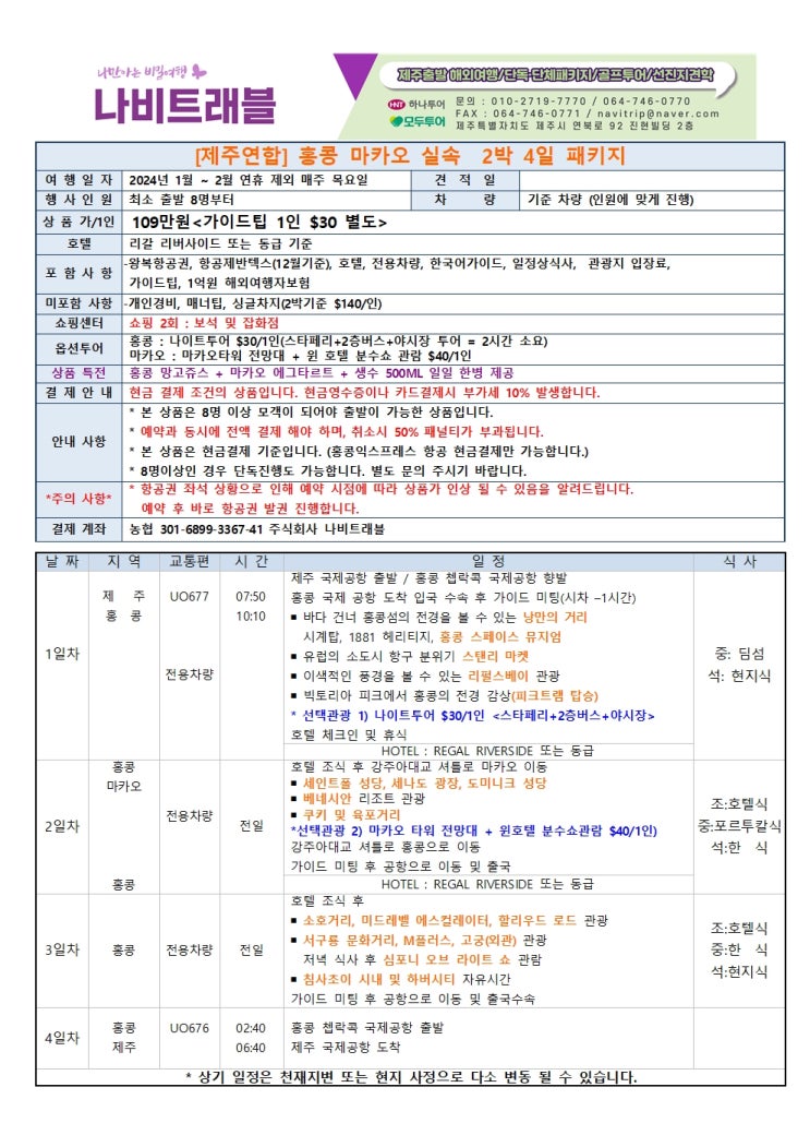 제주 직항 홍콩,마카오 2박4일 연합 해외 패키지 !
