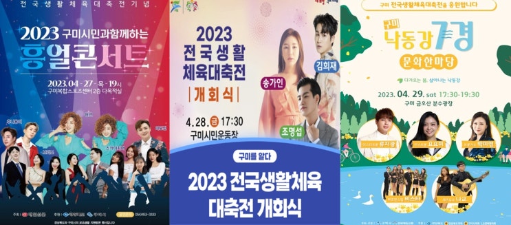 <구미 공연소식> 4.27(목) 구미복합스포츠센터 윙크 이도진 후니용이 / 28(금) 구미시민운동장 송가인 김희재 조명섭 / 29(토) 금오산분수광장 류지광 요요미 박미영