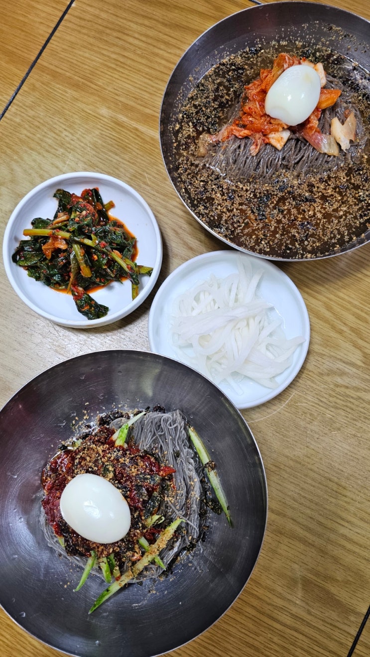 국수남편은 물막국수, 저는 회비빔냉면입니다. 메밀로 만든 막국수, 전분으로 만든 질깃한 함흥냉면을 동시...