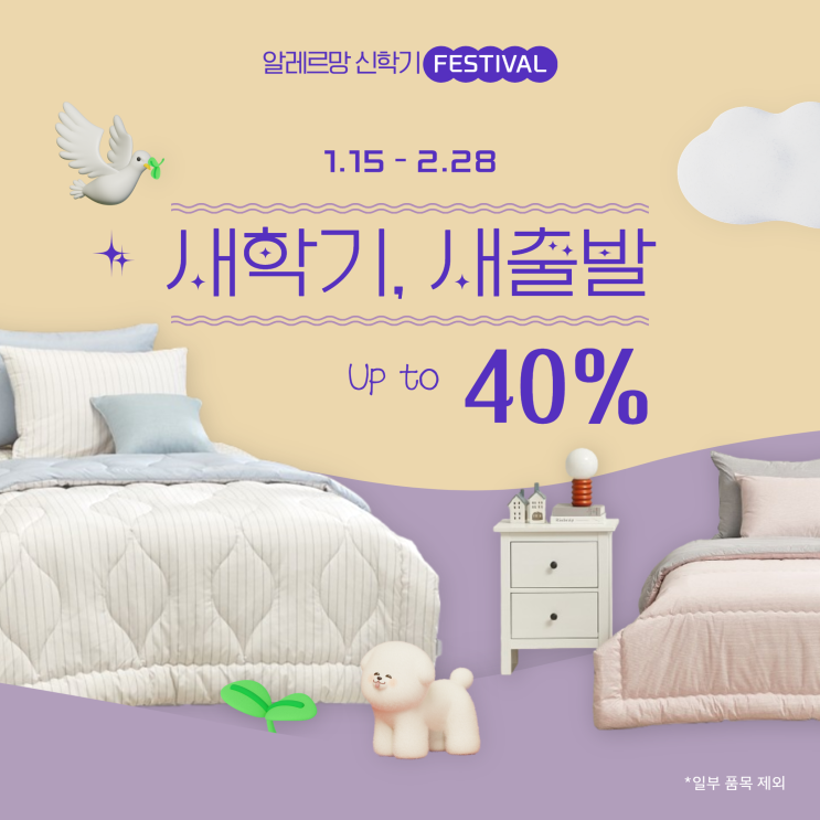 ✨ 알레르망 신학기 페스티벌 ✨ 새 학기를 맞아 알레르망이 준비한 특별한 침구 할인 소식! ⠀ 1월 15일(...