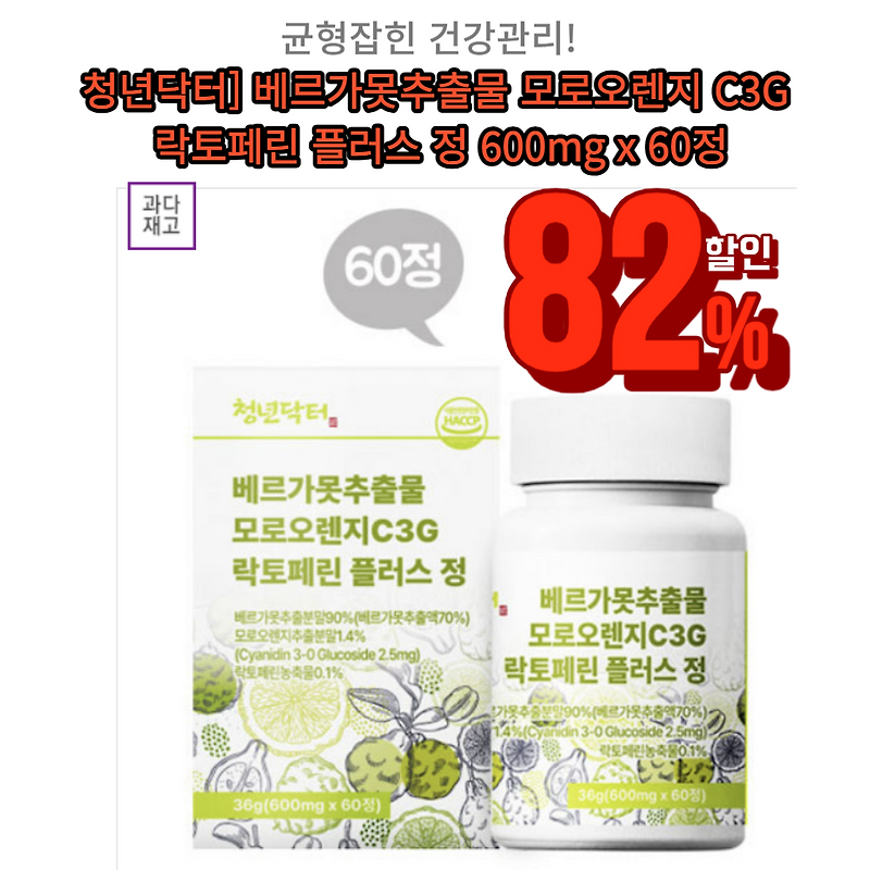 "[청년닥터] 베르가못추출물 모로오렌지 C3G 락토페린 플러스 정 600mg x 60정, 균형잡힌 건강관리를 위한 82% 할인 정보 공개!"