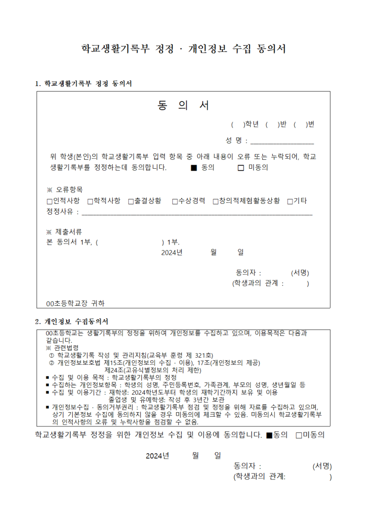 학교생활기록부 정정 · 개인정보 수집 동의서 양식