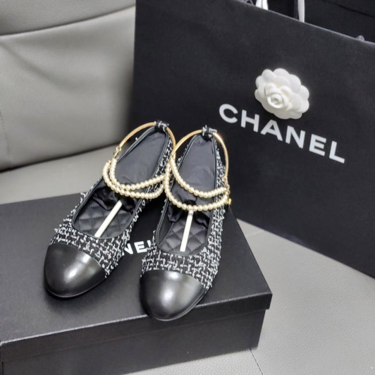 샤넬 진주 체인 트위드 블랙 발레리나 플랫슈즈