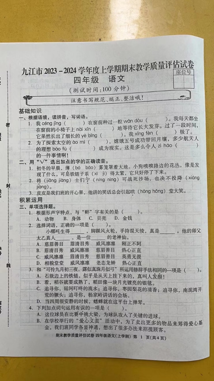 중국육아/겨울방학시작/초4어문 기말시험지