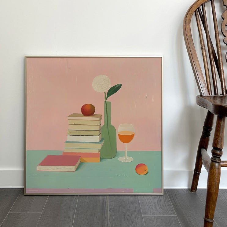 테이블 위 정물 유화 페인팅 인테리어 그림 액자 와인글래스, 리스, 복숭아, 쌓여있는 책 차분하면서 색대...