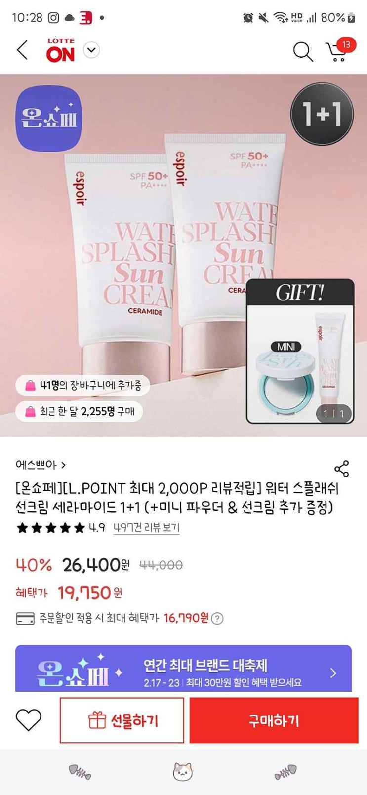 [핫딜] 롯데온 에스쁘아 워터스플래쉬 선크림 1+1 + 사은품! 16,790원에 득템할까 말까?