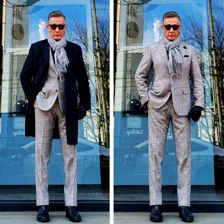 불량소년 2025년 1월 18일 토요일 데일리룩(블랙 앤 그레이:캐시미어 체스터 필드 오버코트, 슈트 정장, 울 터틀넥, 첼시부츠,파시미나 스톨 목도리)