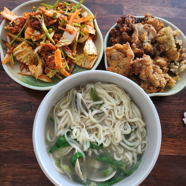 엊그제 아침! 굴튀김과 백합칼국수다. 백합탕 먹고 칼국수 사리 퐁당 넣어서 먹은 백합칼국수 시원한 국물...