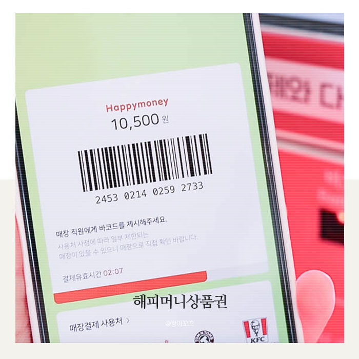 오랜만에 쇼핑몰에 가면서 들른 KFC. 지인이 추천해준 해피머니상품권 바코드결제로 결제하니 지갑도 필...