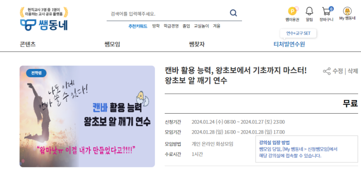 티처빌 쌤동네 - 캔바 활용 능력, 왕초보에서 기초까지 마스터! 왕초보 알 깨기(무료 자율연수, 1월 28일 오후 4시, 1시간)