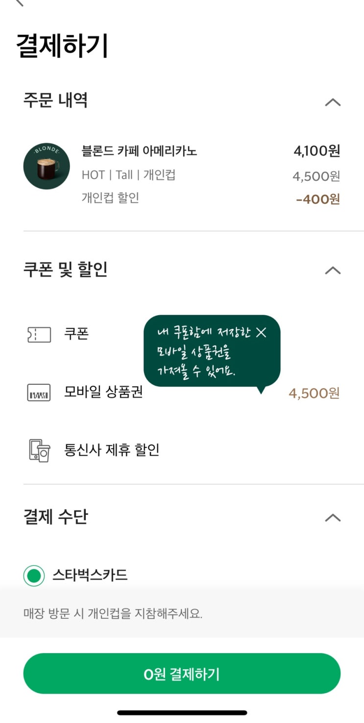 스타벅스 모바일 상품권으로 사이렌오더하기(개인컵 할인 방법)