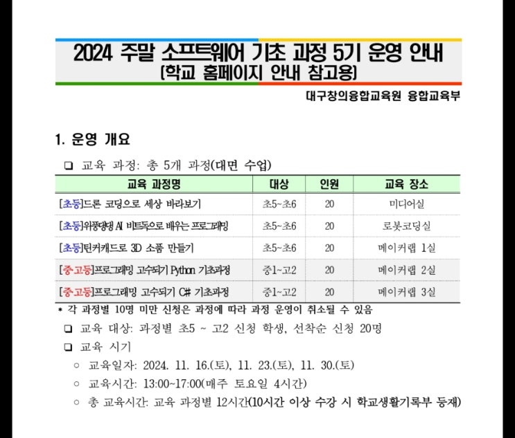 2024년 11월 16일, 23일, 30일 주말 소프트웨어 기초 과정 5기(초5~초6) 대구창의융합교육원 융합교육부