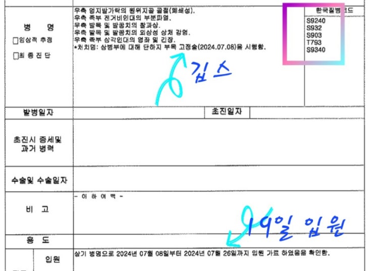 발가락 골절. 금속 고정술 보험금 청구 (산재보험)