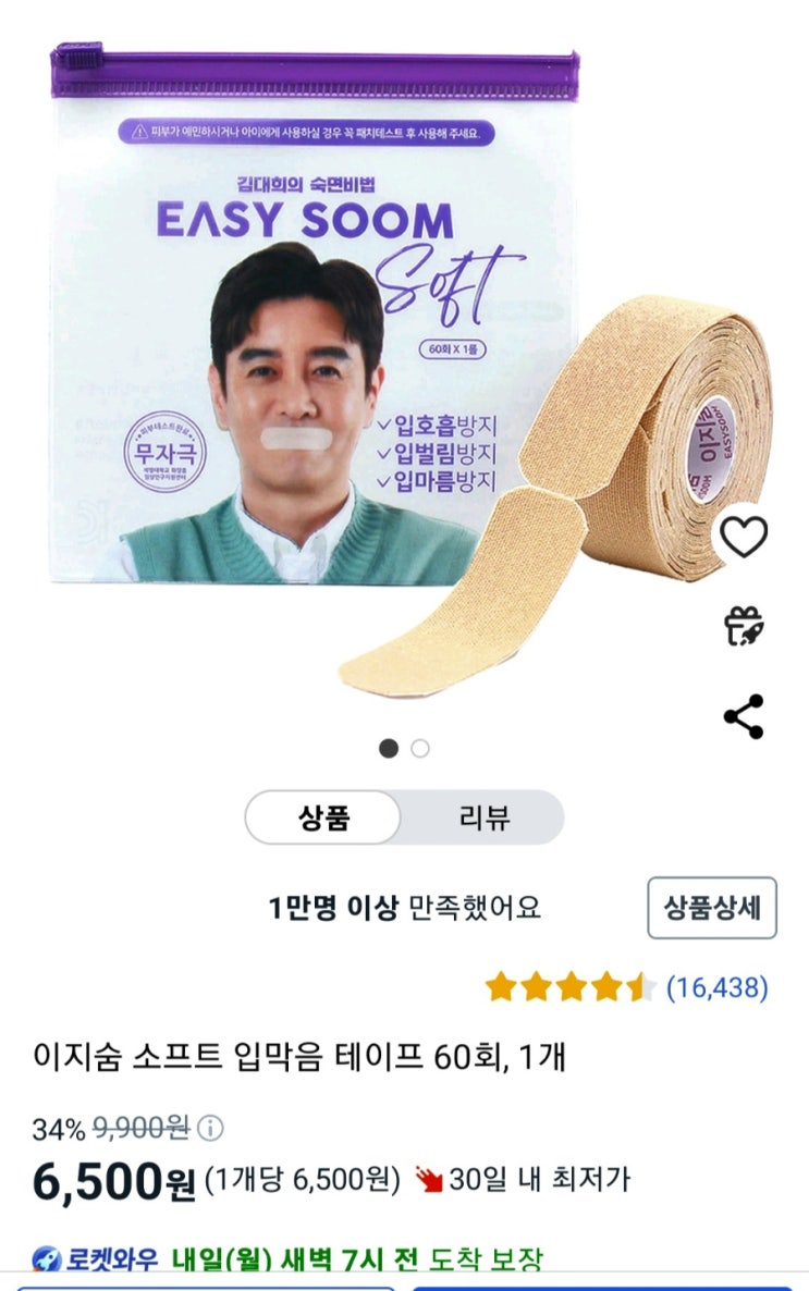 아침이 되면 목이 답답하고 건조해져서 수면 중 물을 마시기도 했는데. 이.지.숨 (easy 숨) 수면 테이프를 ...