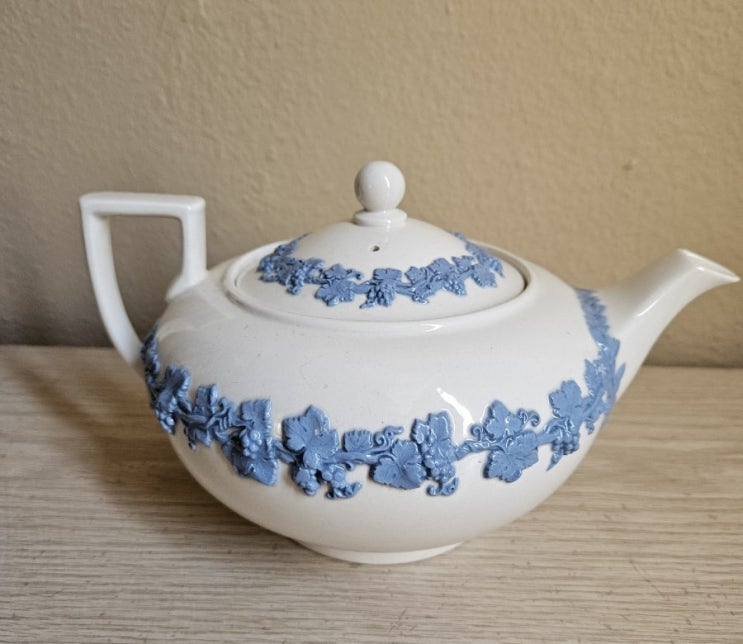 웨지우드 퀸즈웨어 블루 온 크림 티팟입니다. 전체적으로 깨끗하고 좋은 상태로 보존되었어요. 앤틱의 자연...
