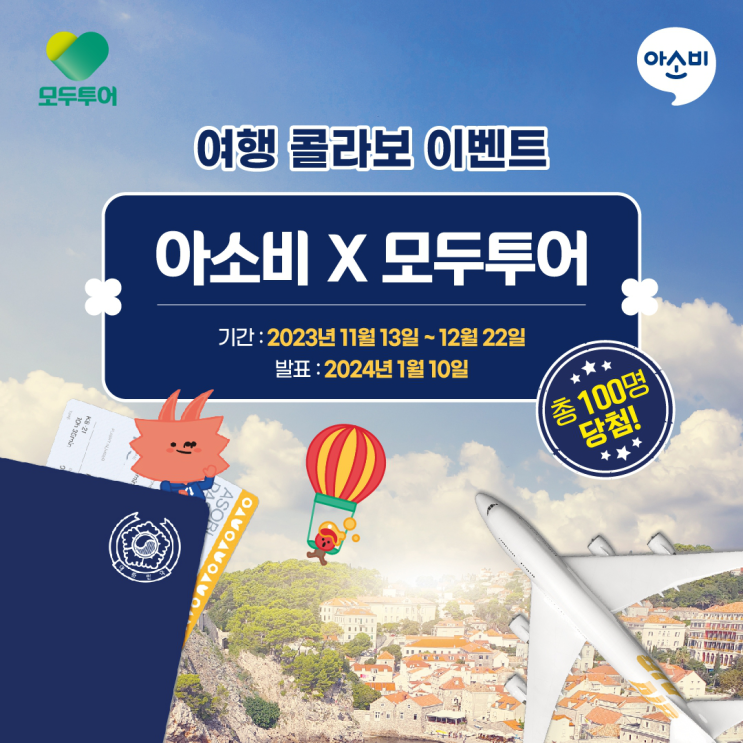 모두투어X아소비 여행 콜라보 이벤트 (총 100명 당첨!/여행상품권400만원권까지?!)