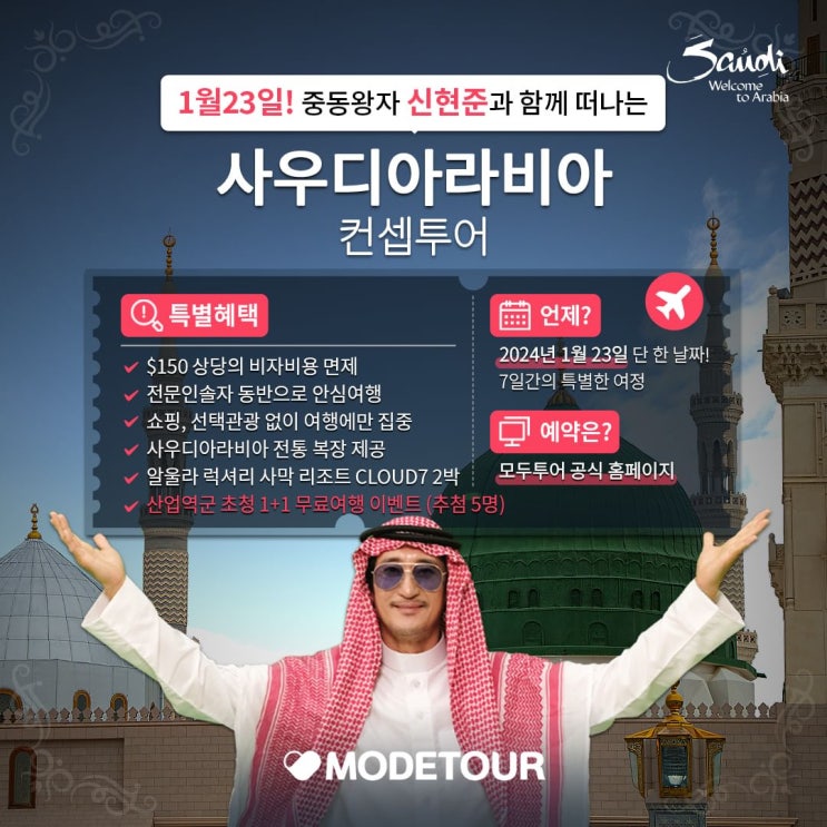 24년 1월 23일! 중동 왕자 신현준과 함께 미지의 왕국 사우디로 떠나보세요! 모두투어 특별 혜택 ✔️$150 ...