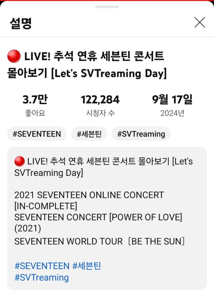 9월 17일에 유*브로 추석연휴 세븐틴 콘서트 몰아보기를 보았다. 드라마 몰아보기를 자주 하던 몸이라 이번...