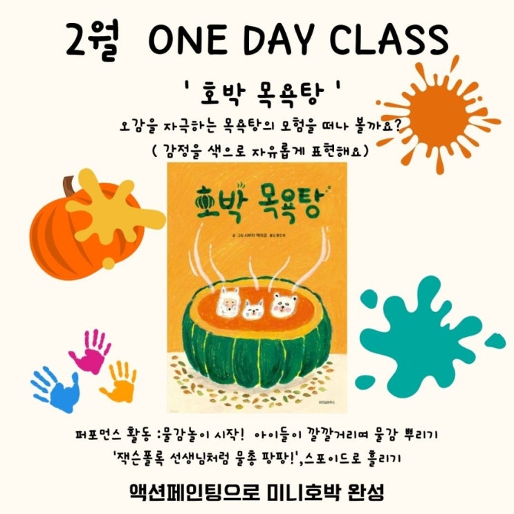 2025년 퐁당아트스튜디오1월 정규/ 2월 원데이 클래스 호박목욕탕 그림책 퍼포먼스 미술수업+잭슨폴록 연계수업