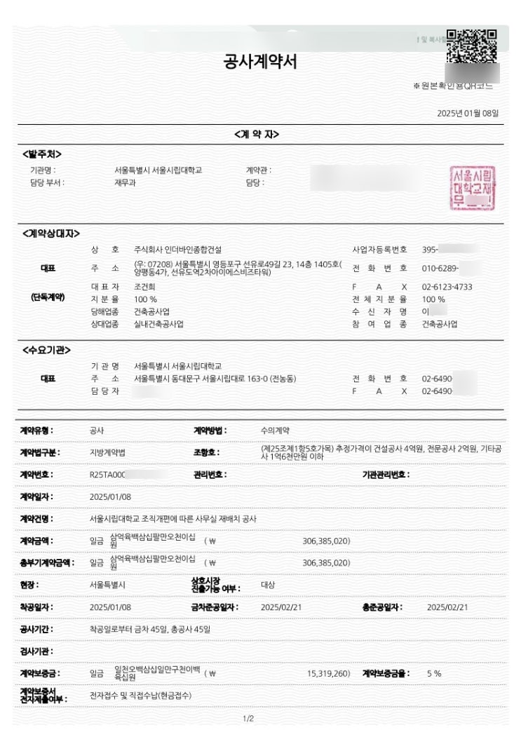 서울시립대 오피스 사무실 인테리어 공사 계약