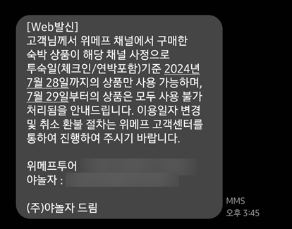 위메프 투어를 통해서 야놀자로 예약했는데 야놀자 측에서 강제취소 문자를 당했습니다 ㅎㄷㄷ 야놀자 쪽에...