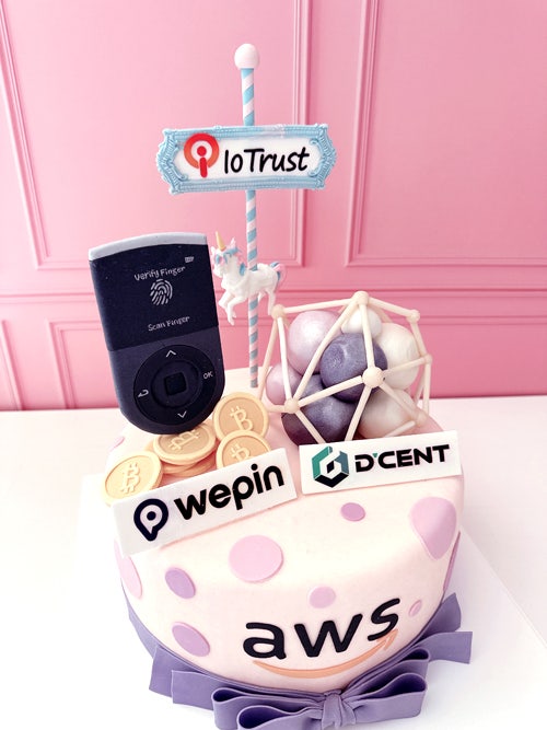 두회사의 로고와 이미지가 함께 나란히 올라간 슈가케이크 입니다 행사용으로 만들어진 보관용 케이크 한땀...