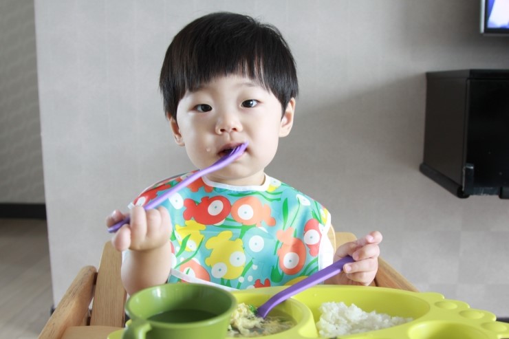 아기 턱받이 바꿨어요! 범킨스 턱받이로 오늘 아침 우리 호돌이 밥먹는 모습~ (지금은 구피 착용중)...