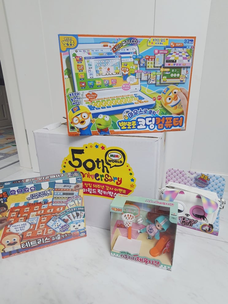 미미월드 50주년 기념 감사이벤트로 럭키박스 판매중!! A세트는 뽀로로코딩컴퓨터/ 브레드이발소 테트리스...