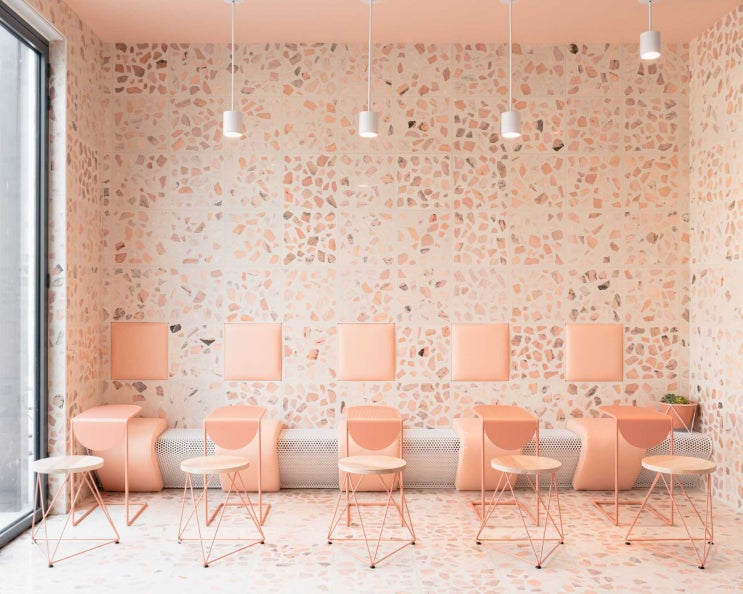 제작한 핑크테라조타일로 디자인된 작은 카페인테리어 디자인_Onyx Coffee Lab