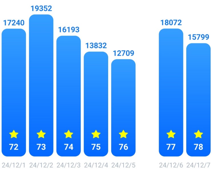 2024년 12월, 걷기 운동.... . 1201일 17,240... 1202월 19,352... 1203화 16,193... 1204수 13,832... 120...