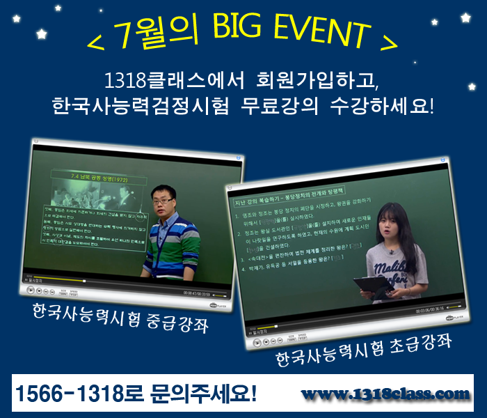 맨투맨영어로 정평이 나있는 1318클래스에서~ 7월 이벤트로 한국사 능력검정시험 중급, 초급 강의를 무료로...