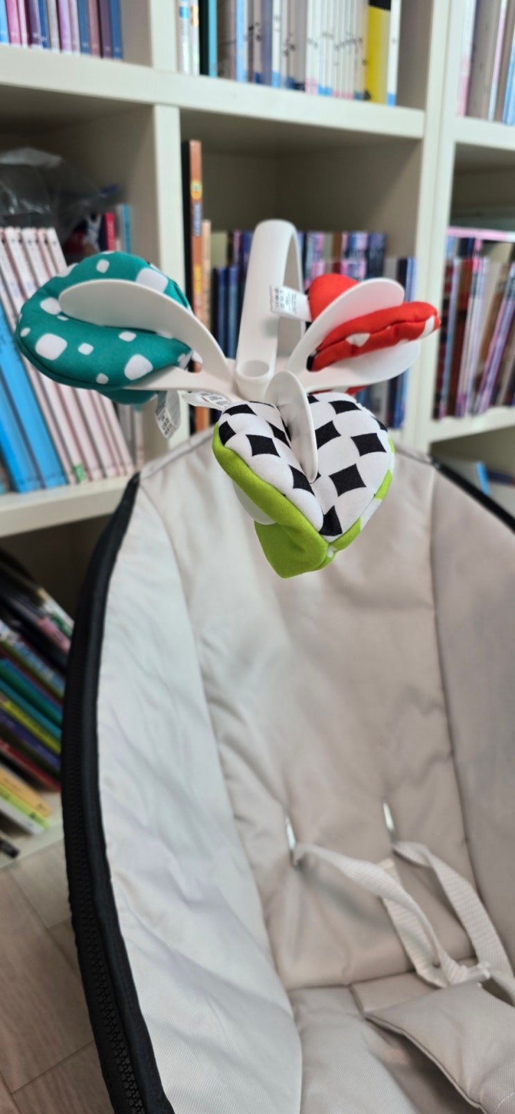 포맘스 전동바운서를 물려받고 바로 커버 세탁을 해서 활용하기 시작했어요. 모빌은 컬러와 흑백으로 되어 ...