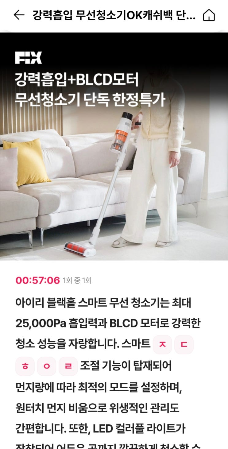 아이리 블랙홀 스마트 무선 청소기 오퀴즈 ㅈㄷㅎㅇㄹ 정답 아이리 블랙홀 스마트 무선 청소기는 최대 25,0...