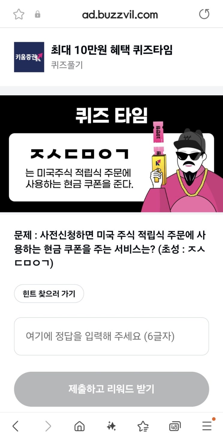 키움증권 초성퀴즈 정답 문제 : 사전신청하면 미국 주식 적립식 주문에 사용하는 현금 쿠폰을 주는 서비스...