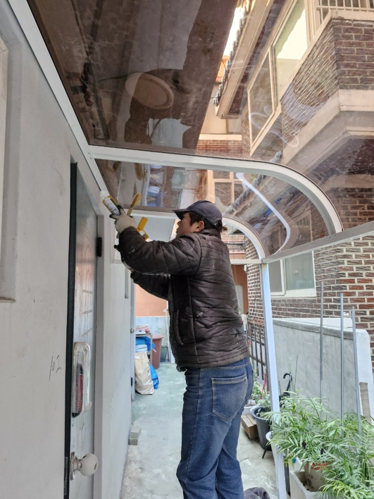 다세대주택 베란다 깨진유리철거 차양막 렉산교체